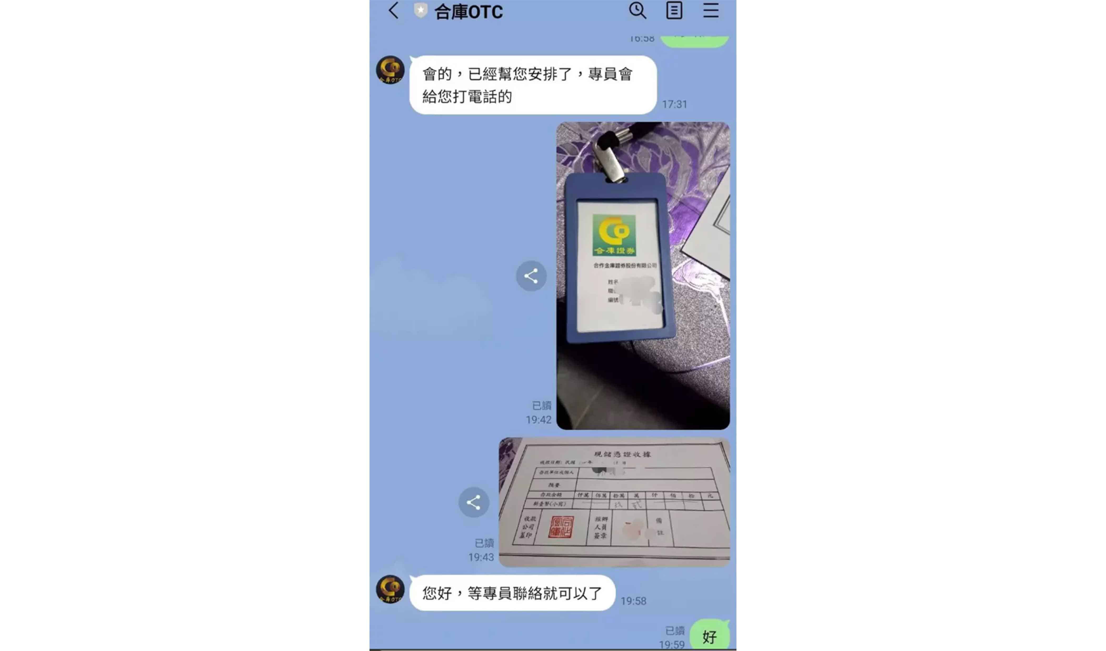 合庫證券任何行銷推廣過程不會要求顧客先支付相關費用及寄送個人帳戶資料,公司人員皆受過完整教育訓練,行銷時亦會表明單位、身分等識別資訊。