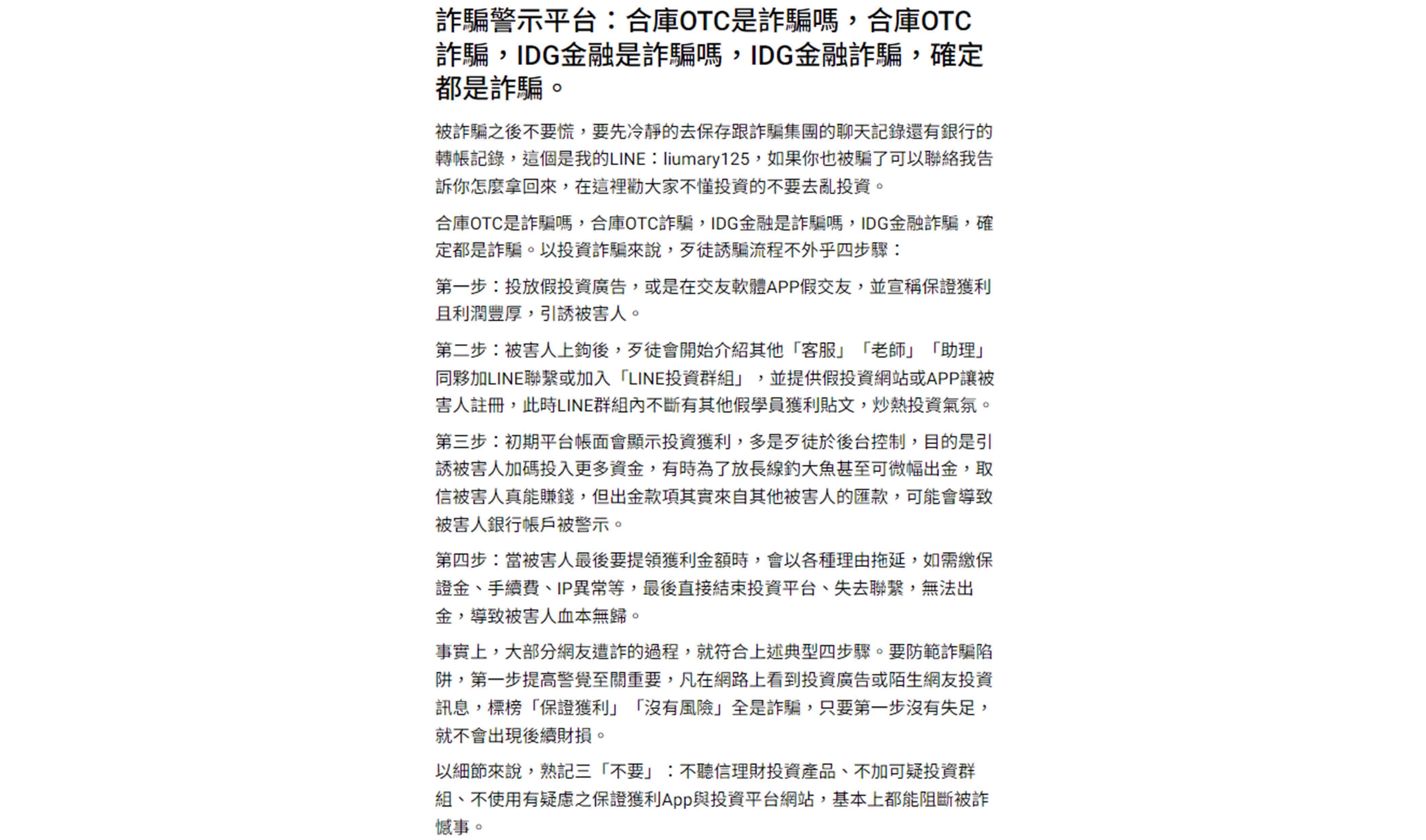 近來有詐騙集團冒名透過社群或交友平台網站認識國內投資人,跨海引誘國人透過證券商所開立之受託買賣外國有價證券帳戶及OTC詐騙,買進市值小及總流通量小等特徵之香港證券交易所掛牌股票, 渠等個股有當日成交量遽增,但股價於投資人買進未久即重挫等共同異常特徵,該類股票流通率較差,且股權過度集中,過度炒作,造成投資人損失。 為避免投資人遭受詐騙,請提高警覺,留意投資風險,以維護自身權益。
