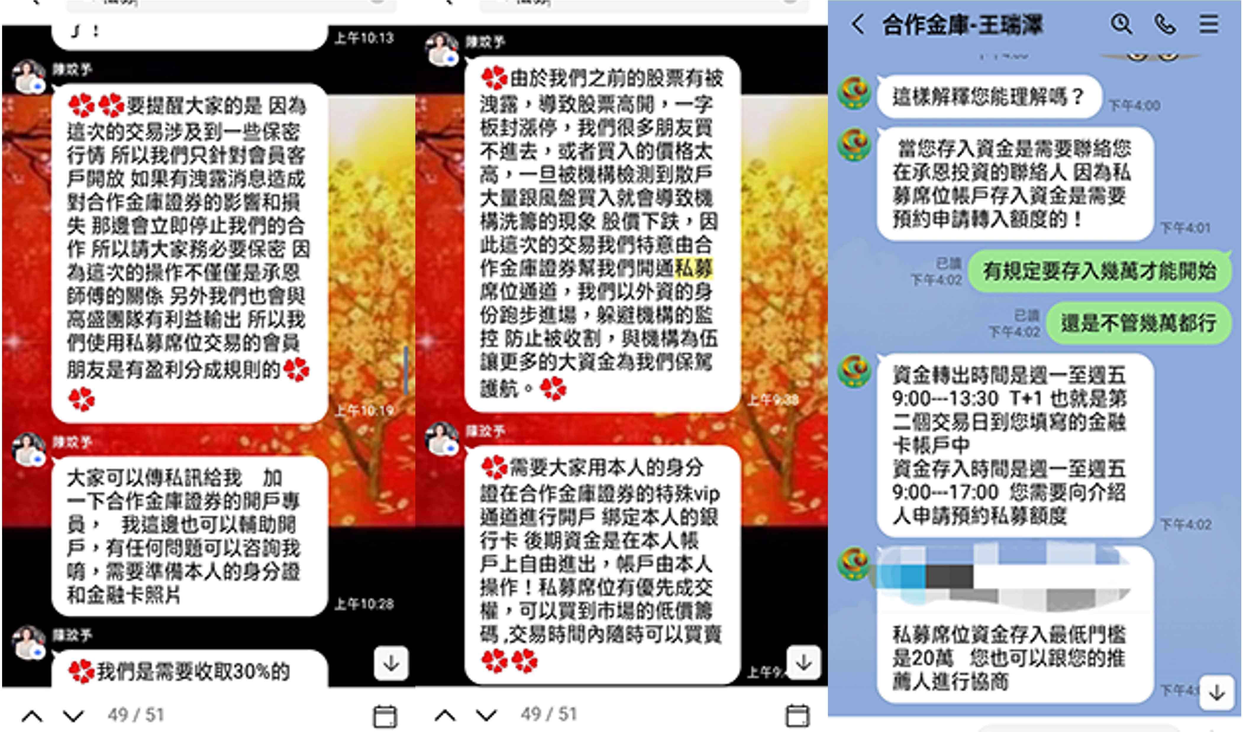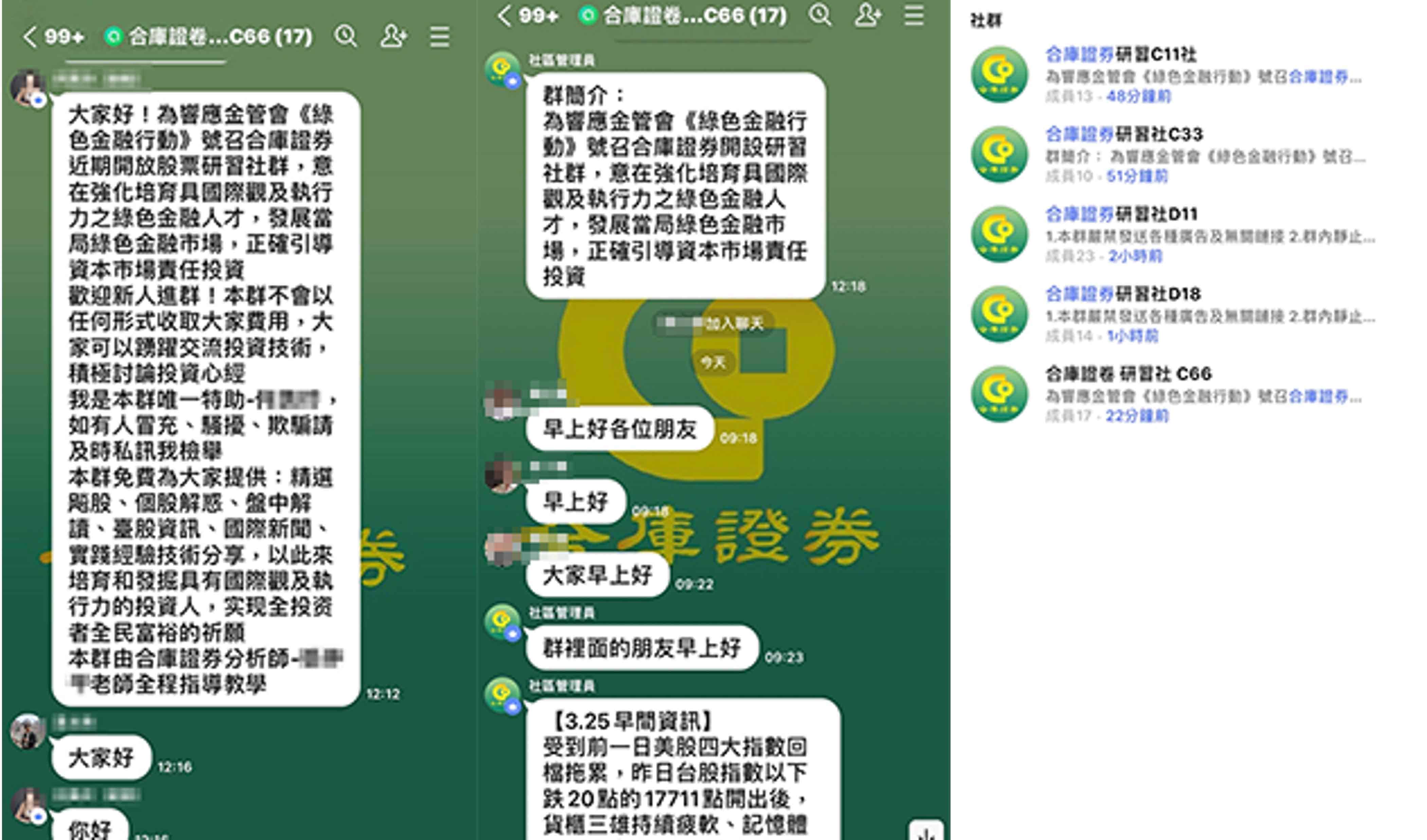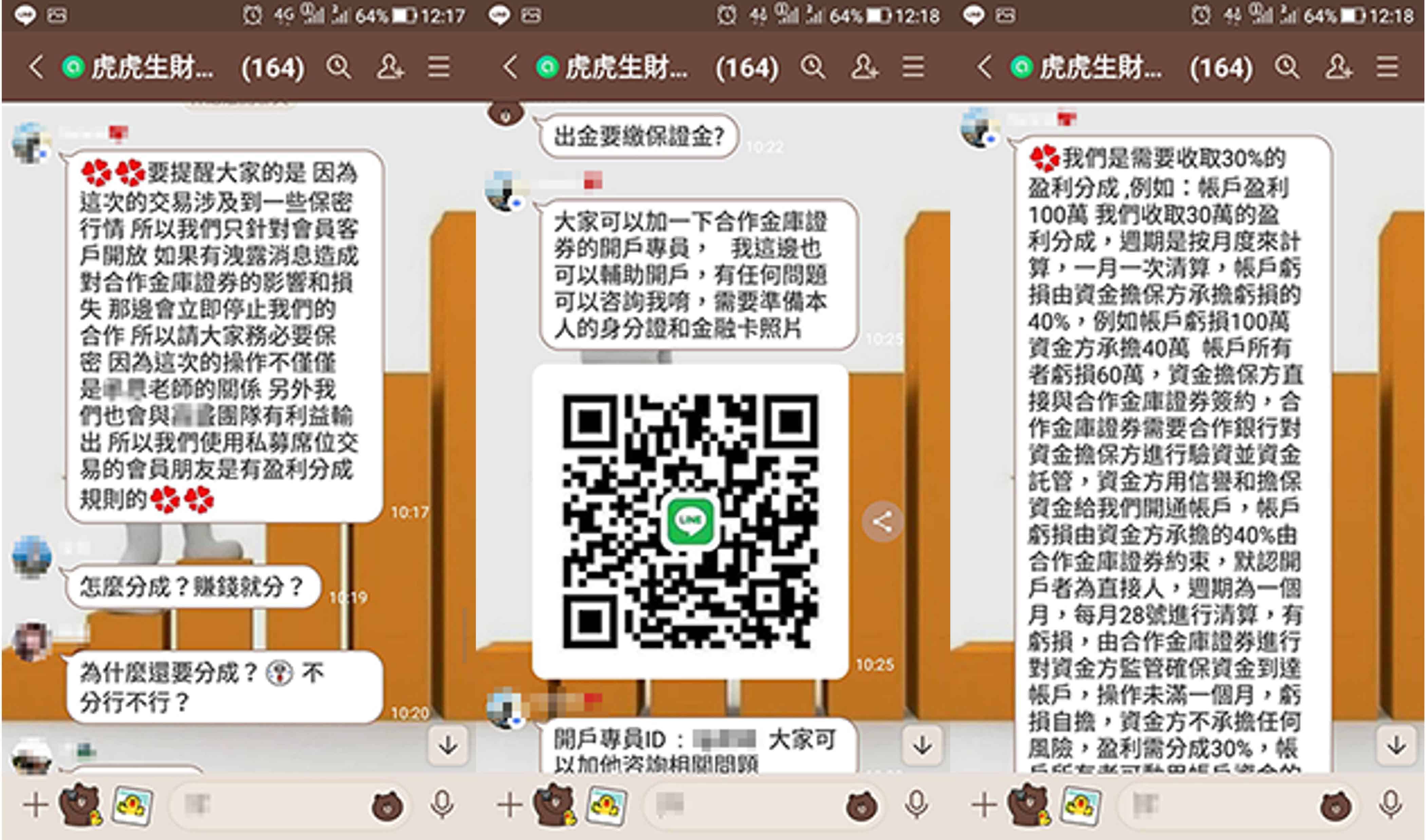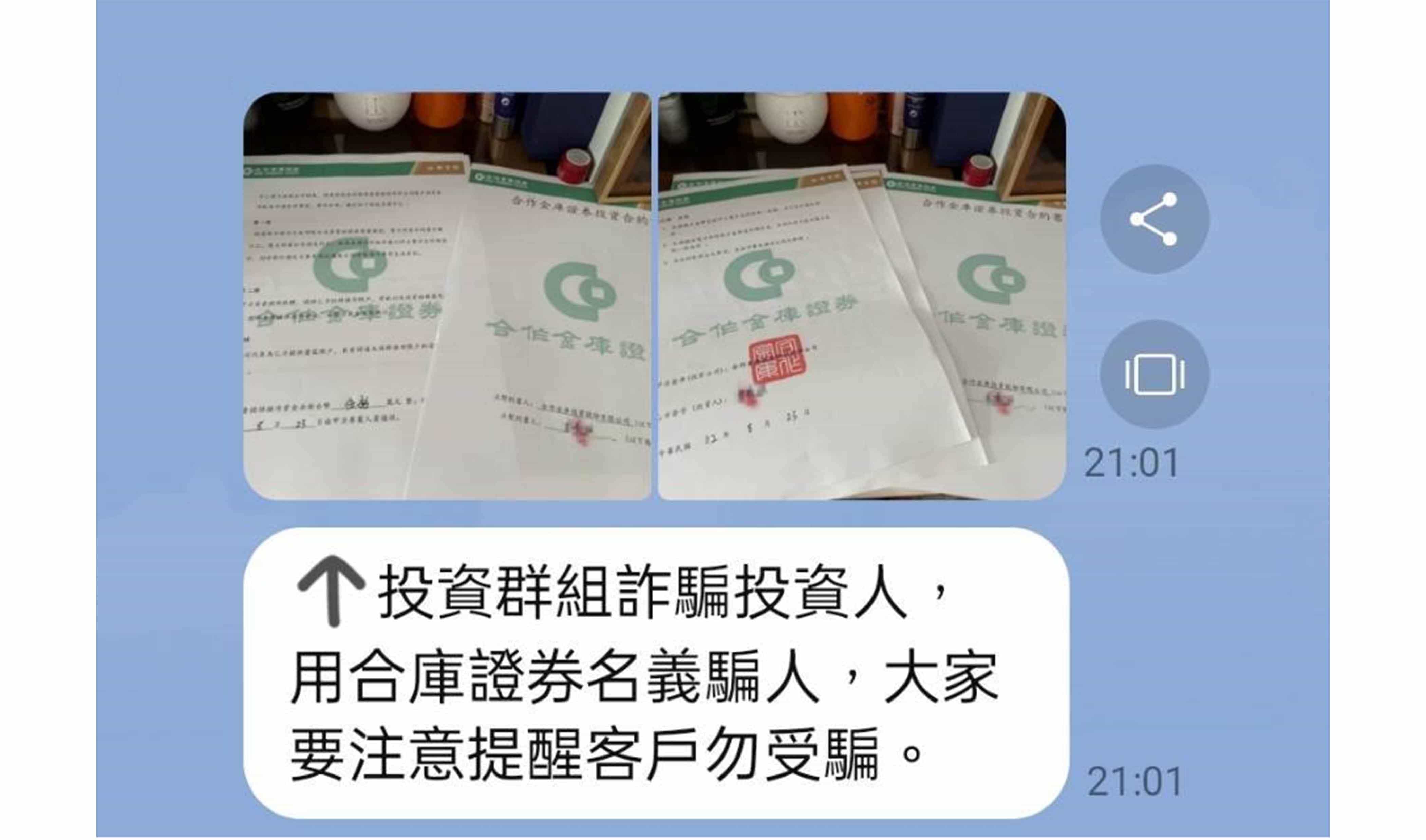 本公司近日接獲投資人反映,有自稱本公司開戶專員或投資顧問「王*慧」、「李*華」、「陳*榮」、「王*翔」、「王*澤」、「承*」、「陳*宏」,並要求投資人加入「合庫OTC」、「虎虎生財」、「金融資訊贏家」、「飄紅天下」、「合庫證券線上客服」等群組會員,掃描其QR-CODE協助開戶,聲稱投資人準備身分證及金融卡即可透過本公司特殊VIP通道進行開戶,用私募席位進行買賣股票,並以外資身分跑步進場,並向投資人收取盈利分成。特此提醒,該「開戶專員」及「投資顧問」並非是本公司及合庫金控集團下子公司員工,且本公司不會使用簡訊、通訊軟體等管道向投資人進行推介,請投資人提高警覺,切勿輕信。 本公司已針對前述情事,向檢警機關報案,請不法人士,切勿以身試法!