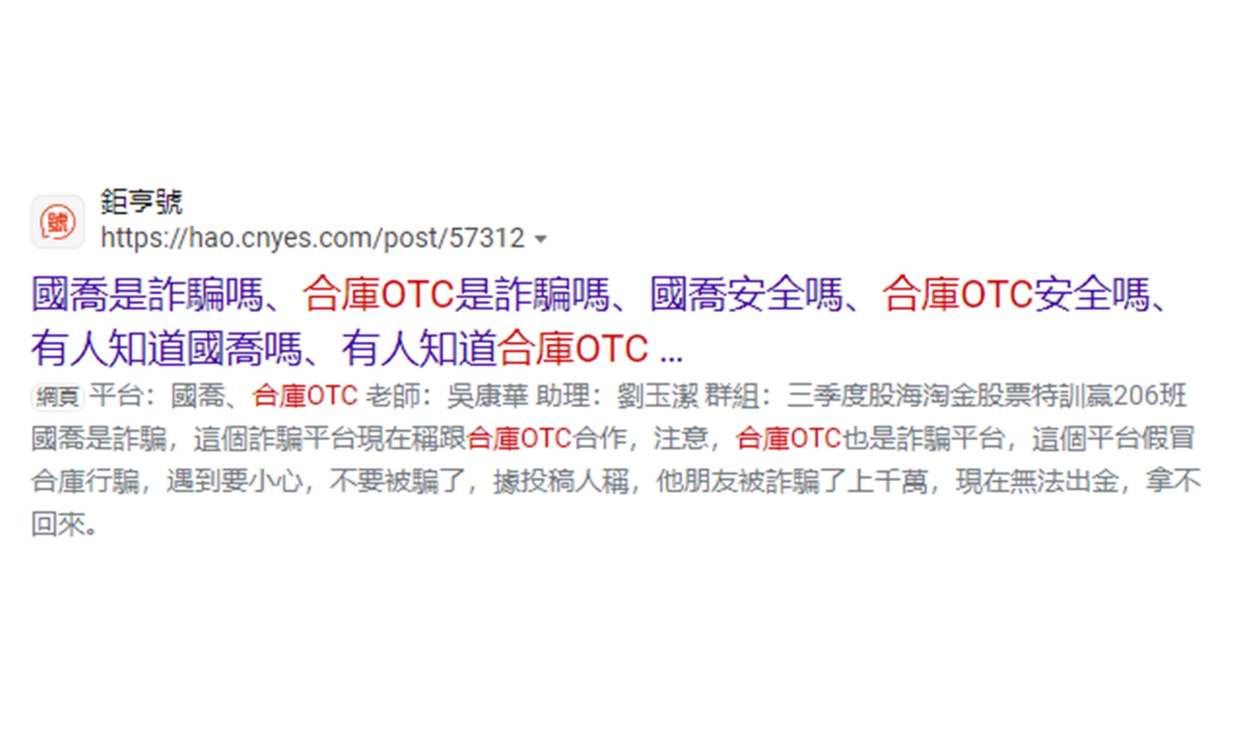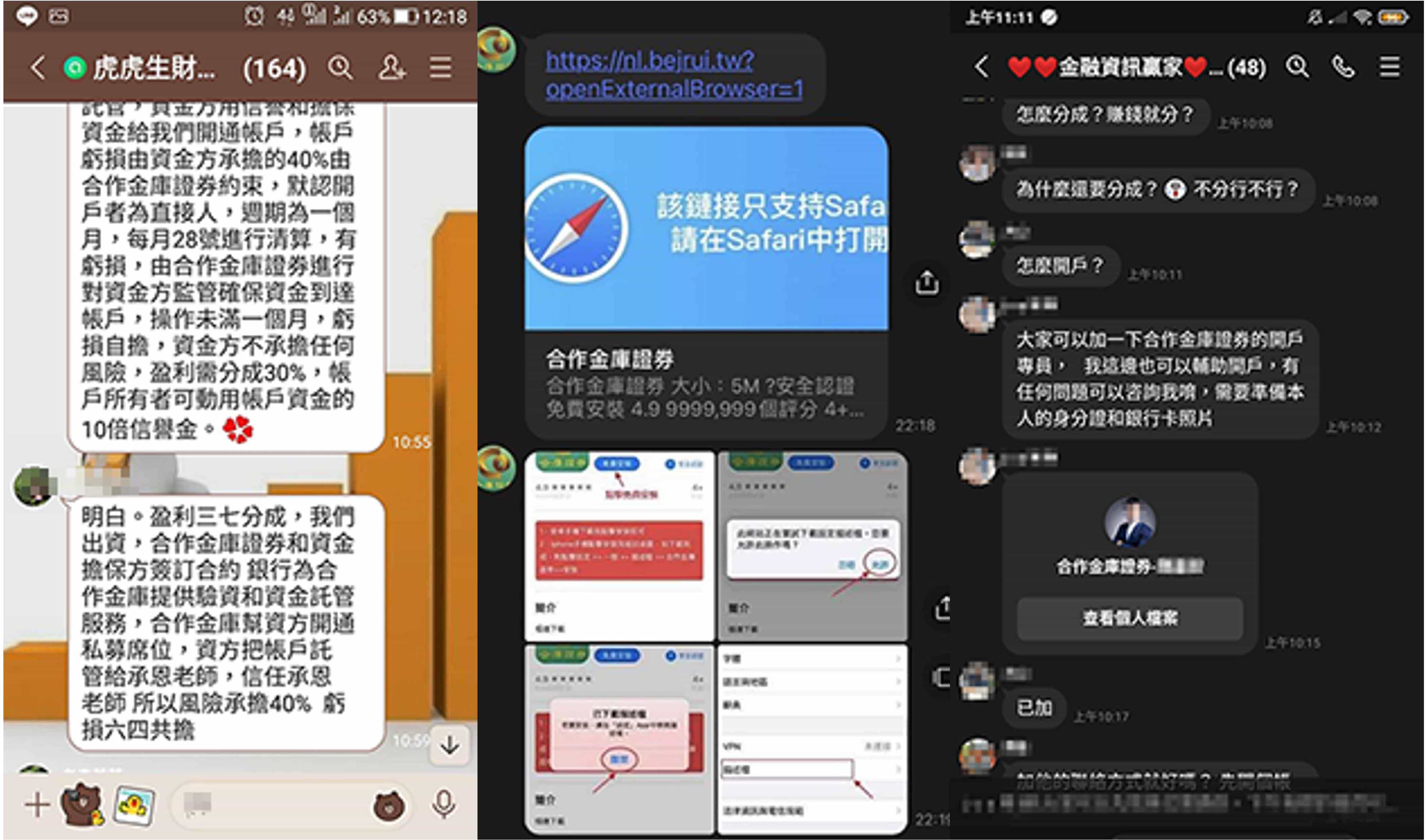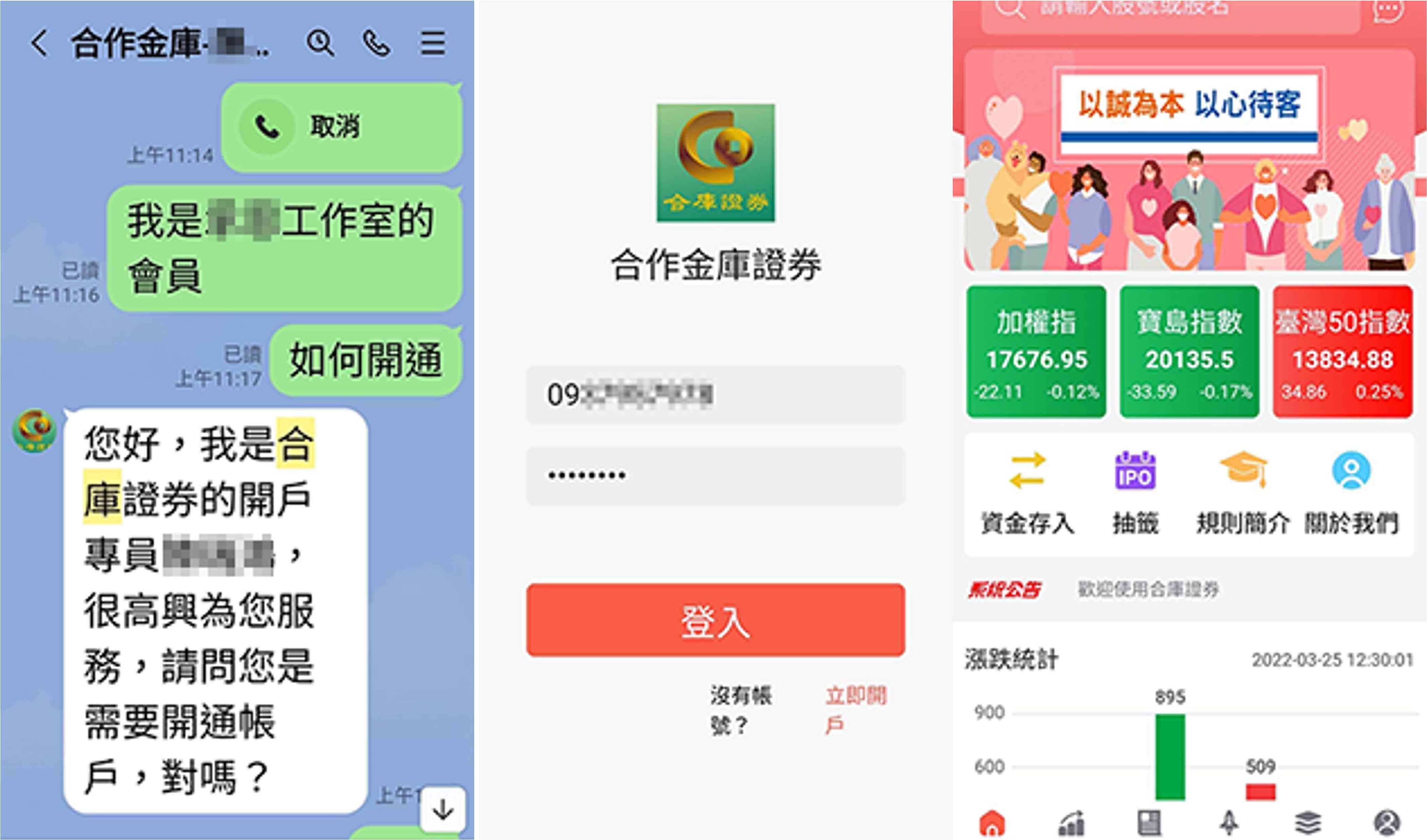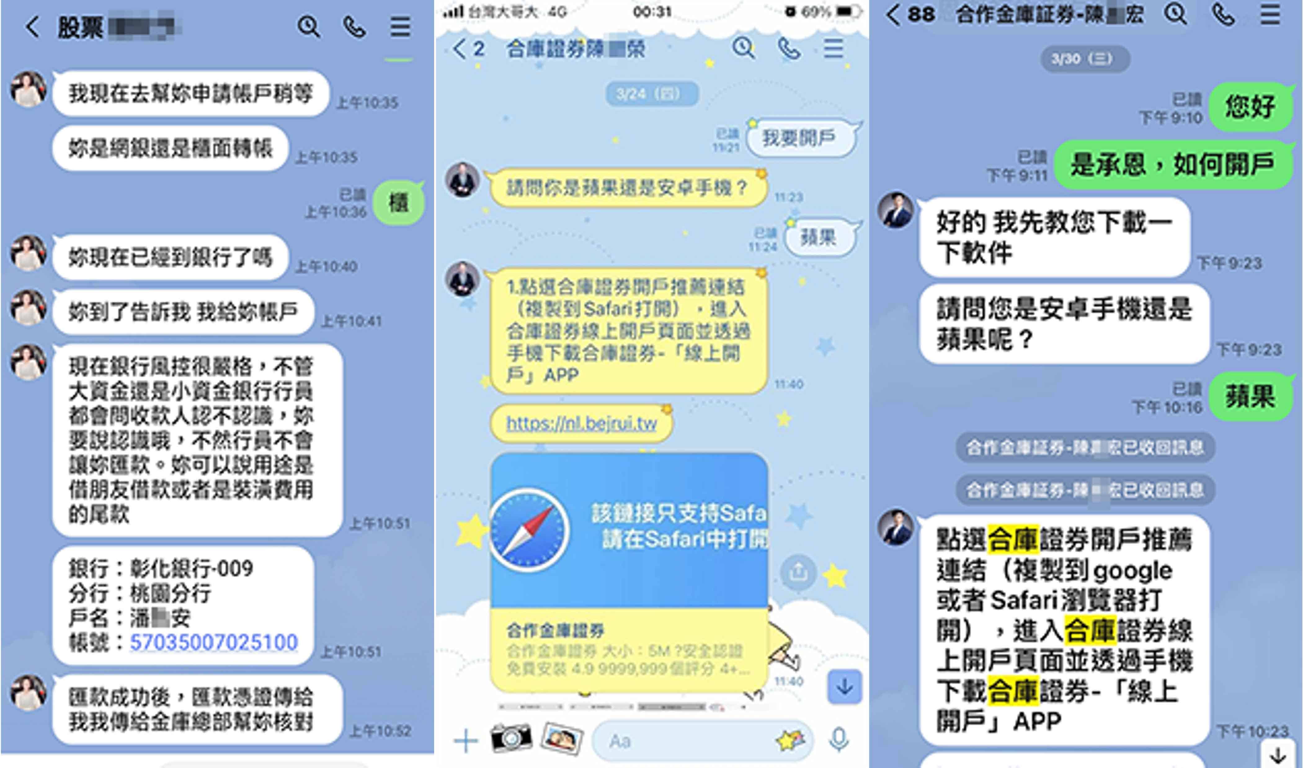 本公司近日接獲投資人反映,有自稱本公司開戶專員或投資顧問「王*慧」、「李*華」、「陳*榮」、「王*翔」、「王*澤」、「承*」、「陳*宏」,並要求投資人加入「合庫OTC」、「虎虎生財」、「金融資訊贏家」、「飄紅天下」、「合庫證券線上客服」等群組會員,掃描其QR-CODE協助開戶,聲稱投資人準備身分證及金融卡即可透過本公司特殊VIP通道進行開戶,用私募席位進行買賣股票,並以外資身分跑步進場,並向投資人收取盈利分成。特此提醒,該「開戶專員」及「投資顧問」並非是本公司及合庫金控集團下子公司員工,且本公司不會使用簡訊、通訊軟體等管道向投資人進行推介,請投資人提高警覺,切勿輕信。 本公司已針對前述情事,向檢警機關報案,請不法人士,切勿以身試法!