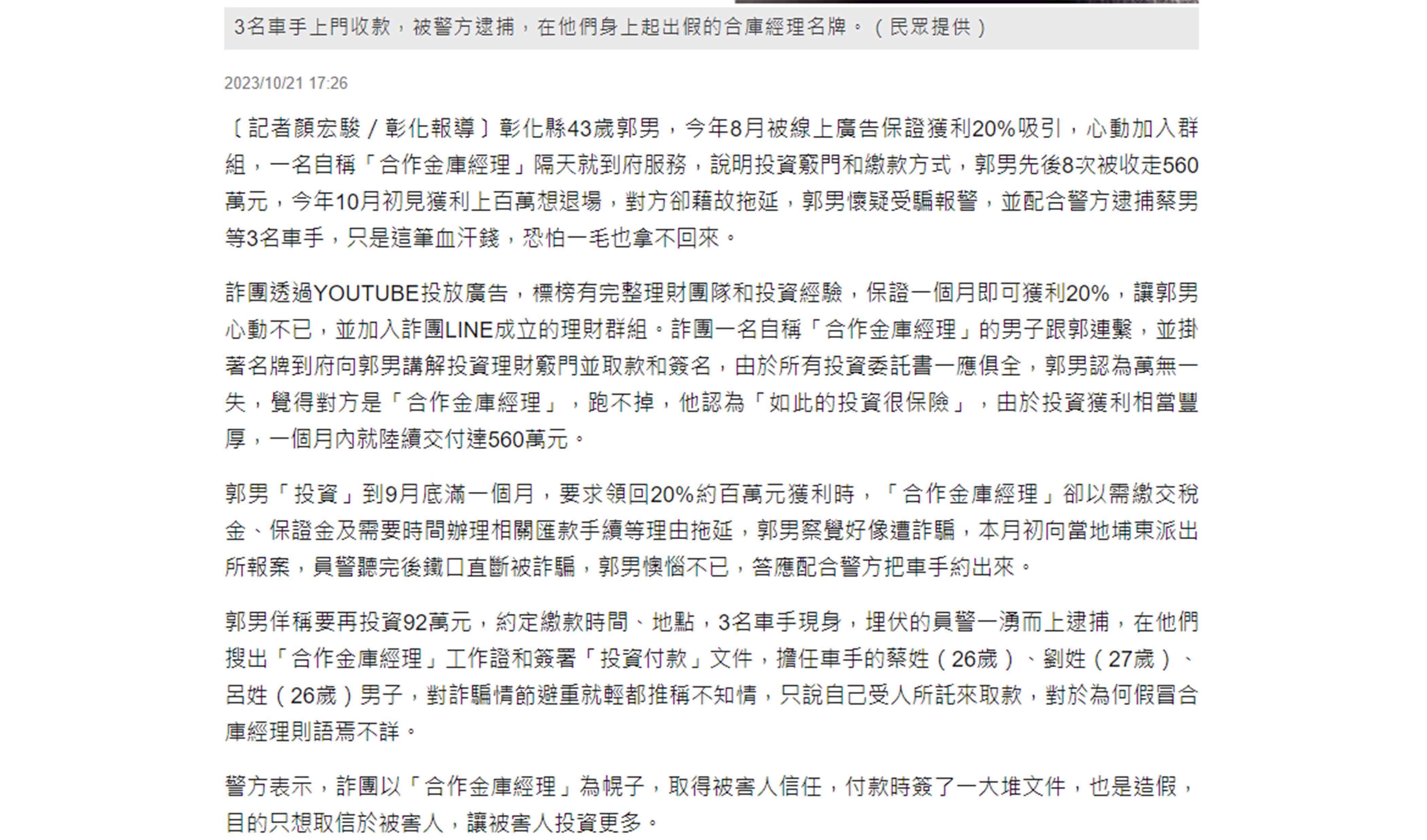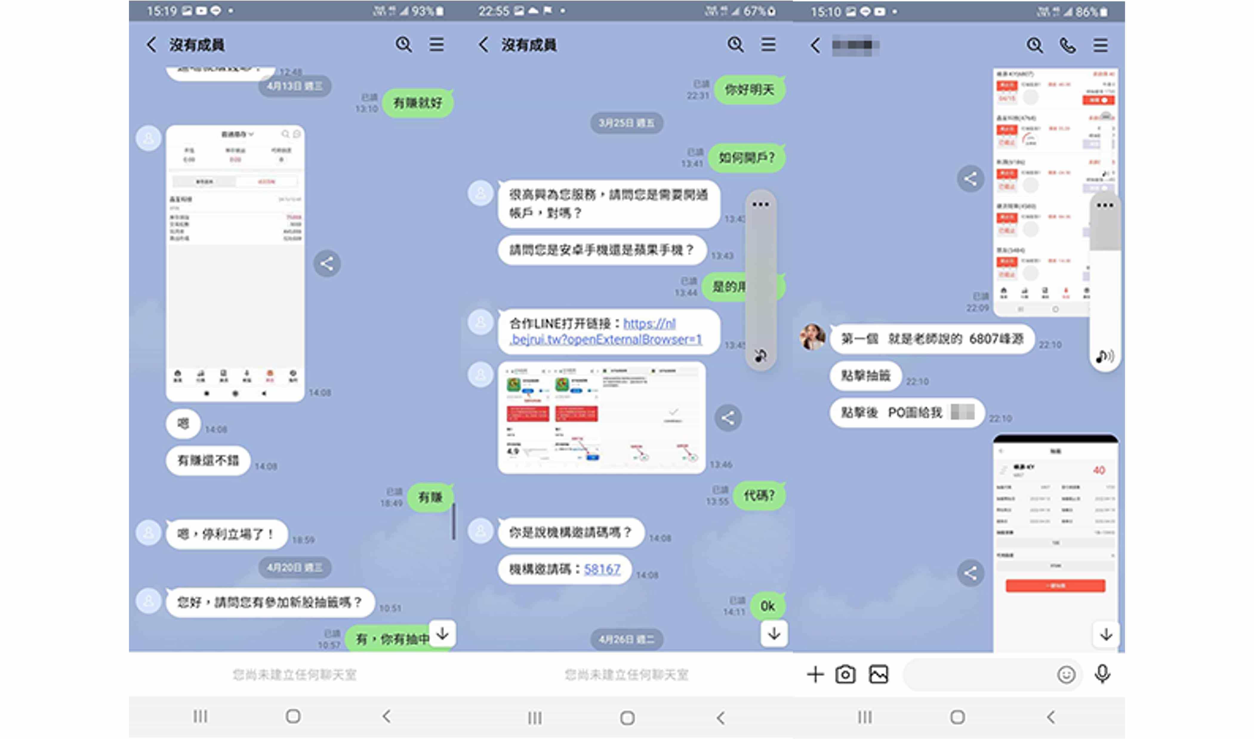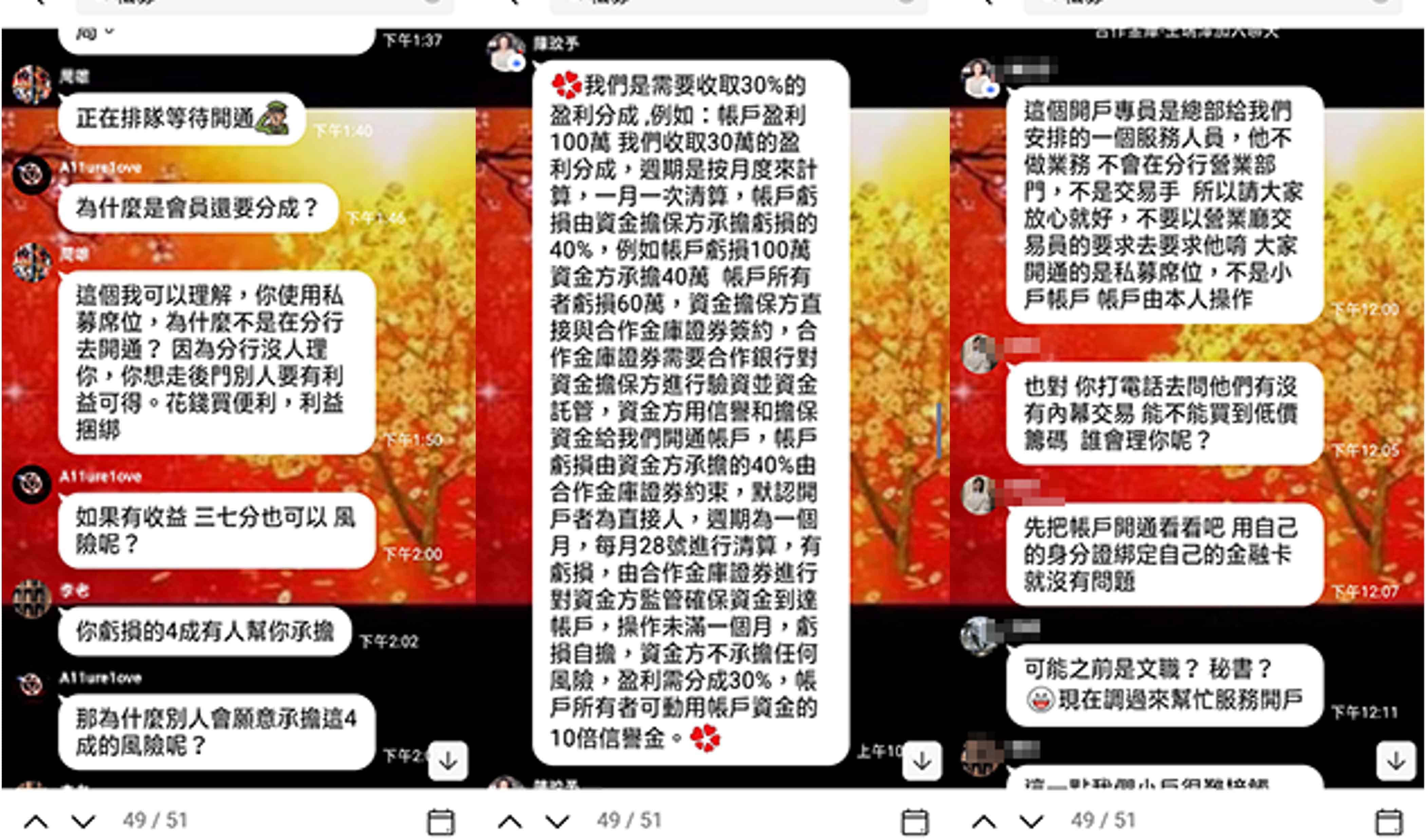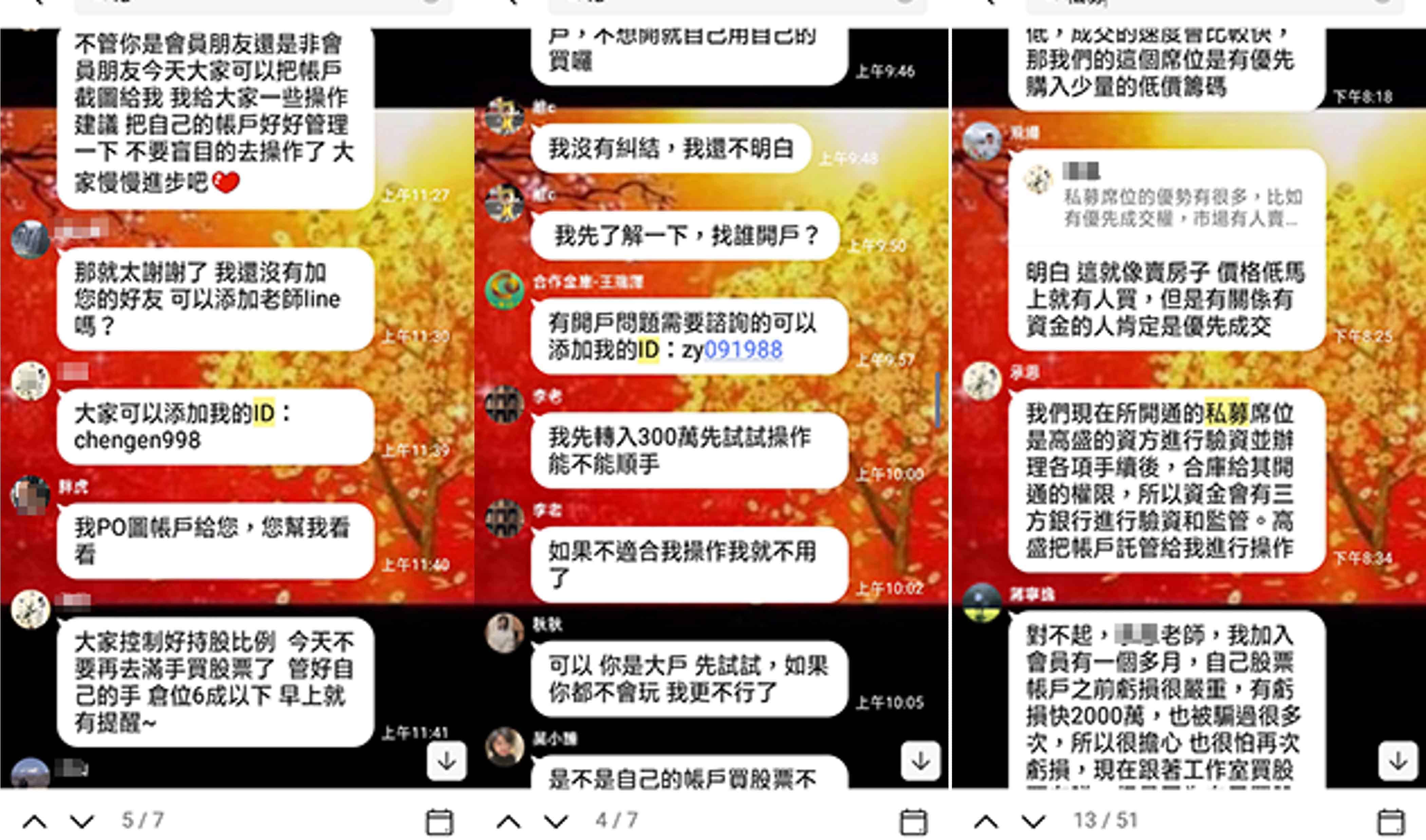 本公司近日接獲投資人反映,有自稱本公司開戶專員或投資顧問「王*慧」、「李*華」、「陳*榮」、「王*翔」、「王*澤」、「承*」、「陳*宏」,並要求投資人加入「合庫OTC」、「虎虎生財」、「金融資訊贏家」、「飄紅天下」、「合庫證券線上客服」等群組會員,掃描其QR-CODE協助開戶,聲稱投資人準備身分證及金融卡即可透過本公司特殊VIP通道進行開戶,用私募席位進行買賣股票,並以外資身分跑步進場,並向投資人收取盈利分成。特此提醒,該「開戶專員」及「投資顧問」並非是本公司及合庫金控集團下子公司員工,且本公司不會使用簡訊、通訊軟體等管道向投資人進行推介,請投資人提高警覺,切勿輕信。 本公司已針對前述情事,向檢警機關報案,請不法人士,切勿以身試法!